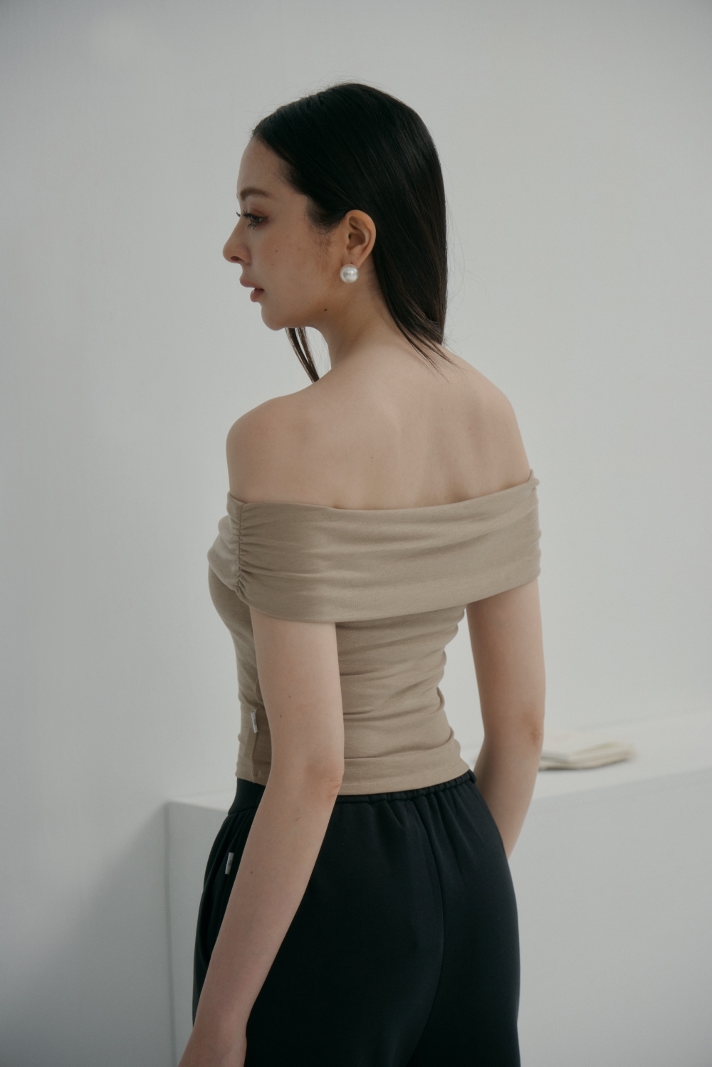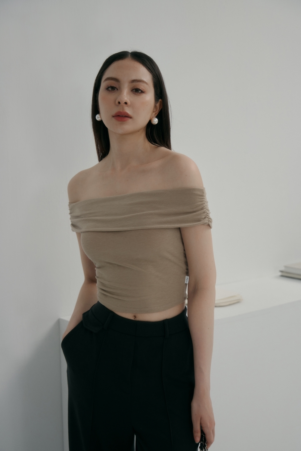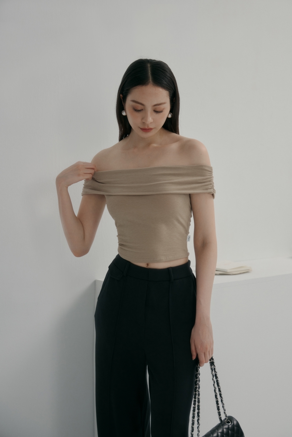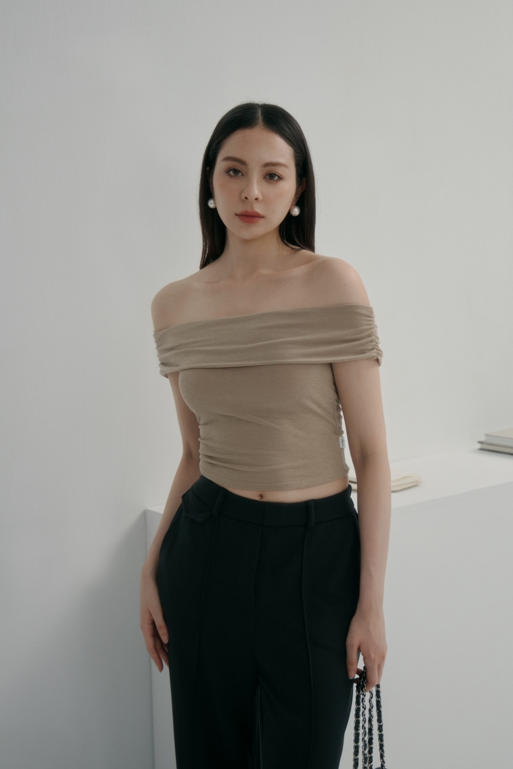 法式一字領BRA TOP上衣- 卡其